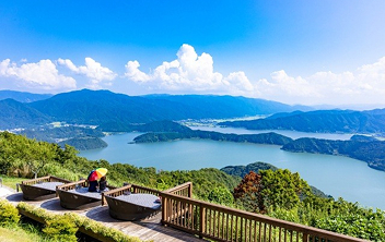 レインボーライン山頂公園の5箇所のテラスからは、三方五胡、若狭湾、そして大空の広がる360度の大パノラマを楽しめます。四季折々の景色はもちろん、足湯やグルメなども魅力です。