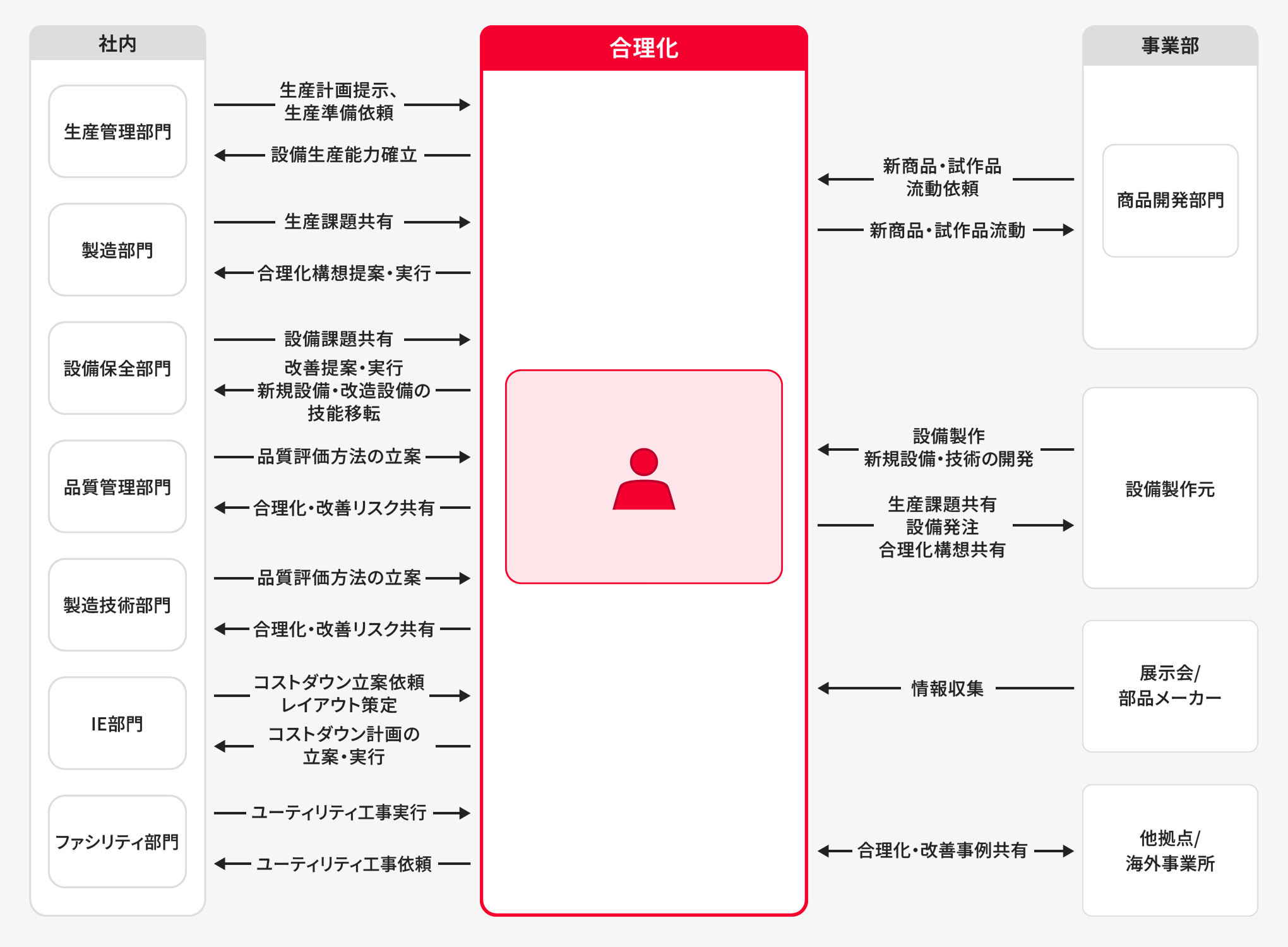 合理化のメインミッションは、会社の利益を最大化すること。4M(人、機械、材料、方法)視点で無駄を洗い出すことからはじめ、設備製作元などと連携して、合理化設備を開発・改善。関係部門とともに、現場への導入までをワンストップで進めていきます。