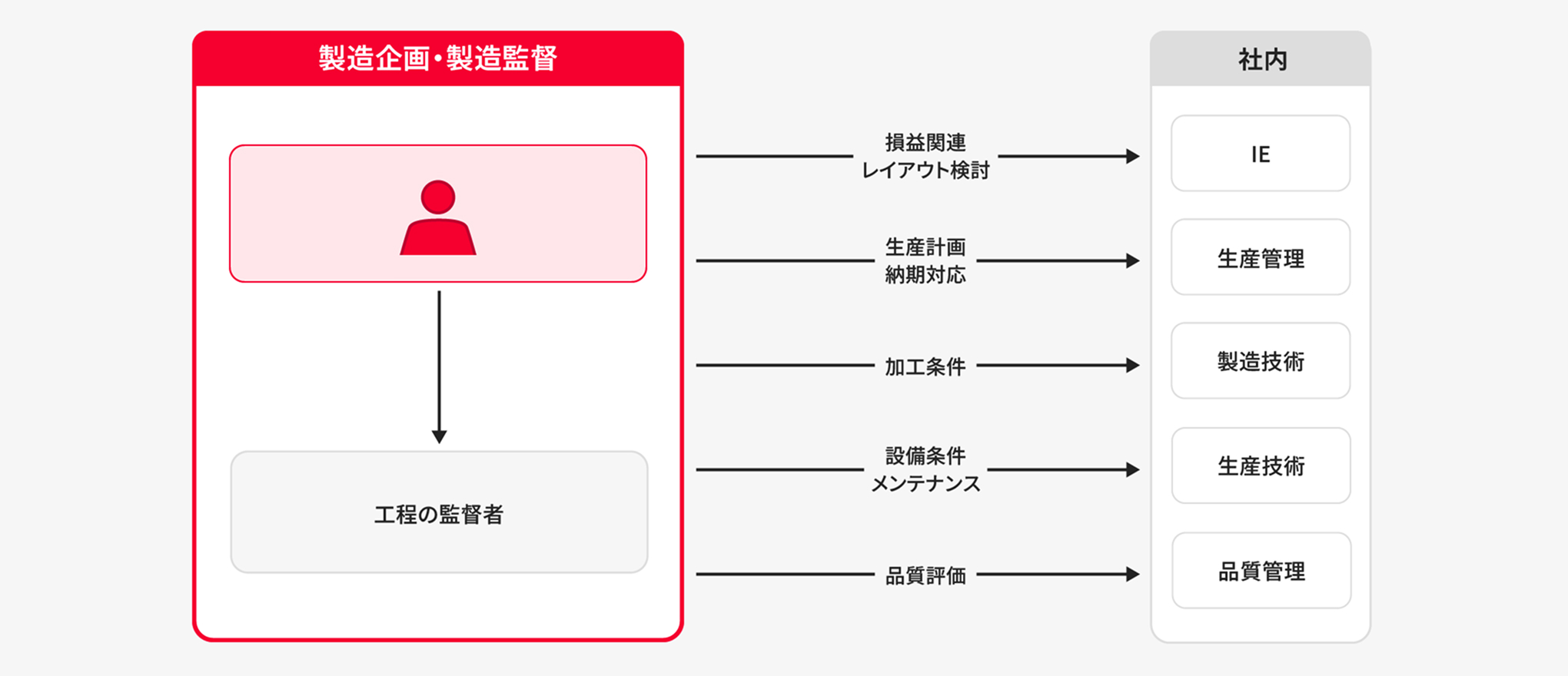 QCDS(品質、コスト、納期、サービス)を管理するのが、現場の監督者としての主な業務です。特に生産遂行は、生産計画の試算や準備から実行管理に至るまで、さまざまな要素が絡み合った仕事です。幅広い視点で課題に気づき、対応していく必要があります。計画どおりに生産を進めるには、製造技術・品質管理・生産技術といった関係者との協働も欠かせません。