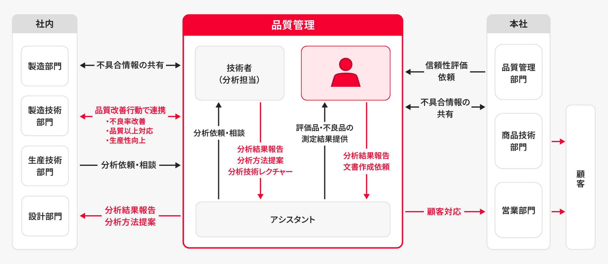 製造工程の管理では基本的な品質改善活動を始め、工程不具合や是正の処置、ヒューマンエラー対応、変更管理などに取り組みます。購買品品質の管理では、部資材受入検査や部資材供給者監査などを担当。出荷した製品の品質保証では、お客様からのクレームや監査にも対応します。