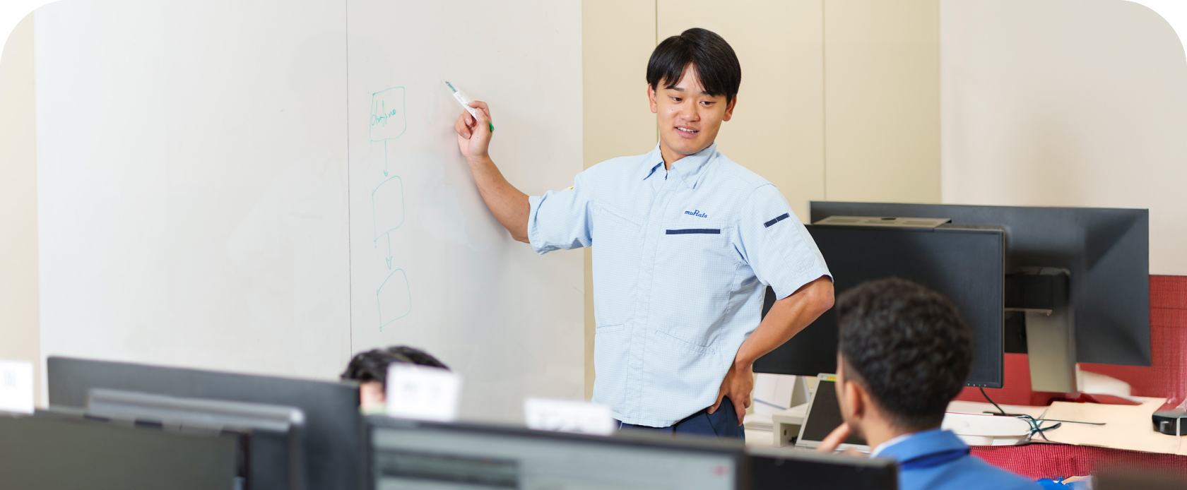 私の所属する部署は、製造現場や社内業務をITで支えています。主な業務は、セラミックコンデンサの生産活動や品質管理を効率化するシステムの開発・運用・改善です。私は、その中で、システムエンジニア(SE)の役割を担っています。SEと聞くとPCに向かうイメージですが、実際は製造現場で働く人々と直接コミュニケーションを取り、使いやすい仕組みを考える機会が多くあります。特定の部署に限らず、工場内の多くの人々と関わりながら仕事ができる点も魅力です。現場の効率性向上やミス削減といった変化が生まれることで、自身の仕事が役立っていると実感できます。また、海外拠点プロジェクトにも参加し、現地密着型でありながらグローバルな視点で活躍できるのが特徴です。