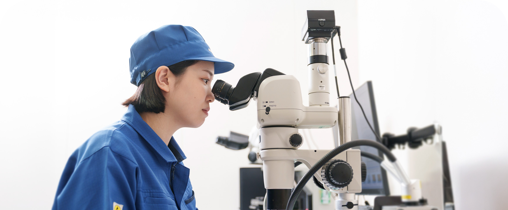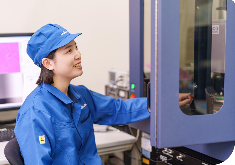 私の所属する部署は、つくった製品の出来栄えを評価する部門です。製品をお客さまに安心して使っていただくために、特性がきちんと出せているか測定したり、お客さまと同じような環境で実装したり、信頼性試験と呼ばれる過酷な環境下での試験を実施したりします。また、万が一故障が発生してしまった場合は、それを解析し、不良をつくらない工程となるように製造部門や開発部門にフィードバックを行います。